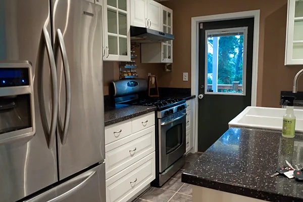 A project that took us a long time to tackle was the kitchen. The color of the walls was a rosy brown color that was actually really pretty, but it just wasn't working well with all the white and gray counters, cabinets, appliances and floors. Our house is also really shaded outside, so it gets pretty dark in there.