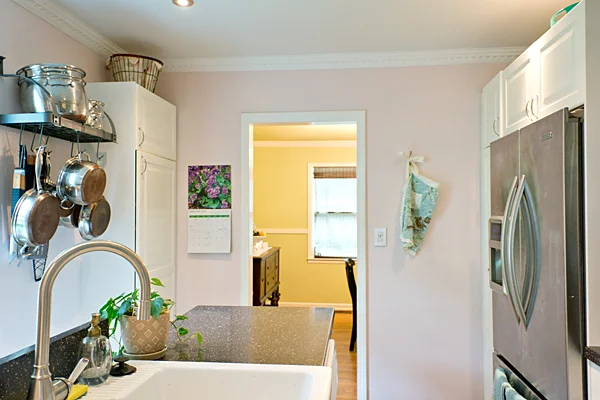 I wanted to brighten the kitchen up, and after months of living with huge, ugly paint swatches on the walls in cream, white, pink, peach, and gray, we finally settled on a light pink.